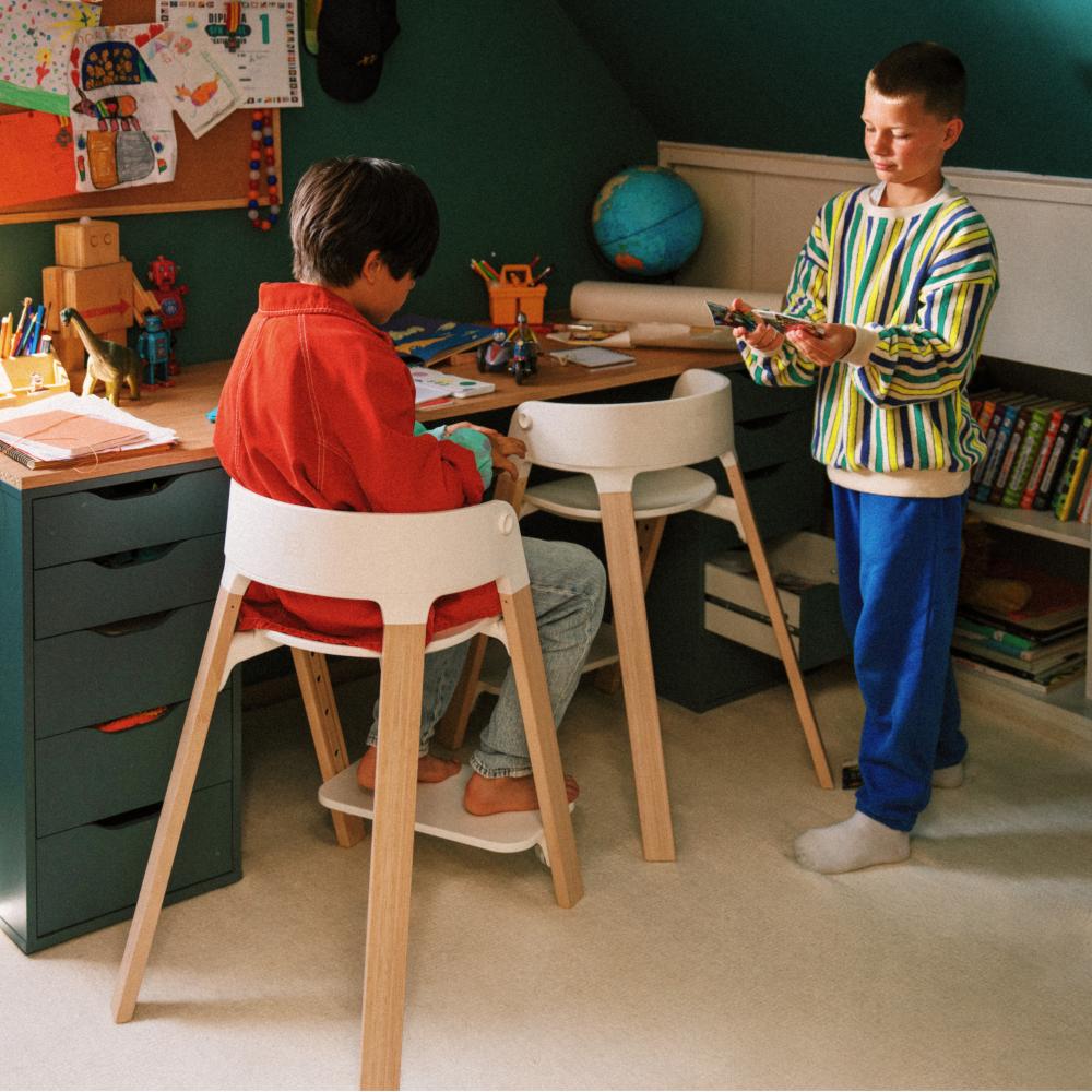 Tripp Trapp® recommendation offers options in oak and beech wood, each providing a different texture and feelings. Combined with different colors and accessories, it allows for the customization of a unique high chair for each child. Suitable for use from infancy to adulthood, it is a baby chair style that can grow with the baby.